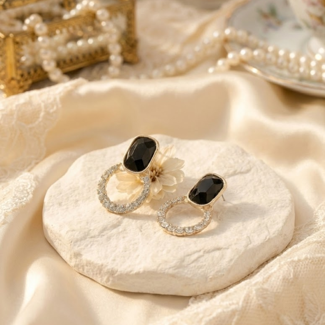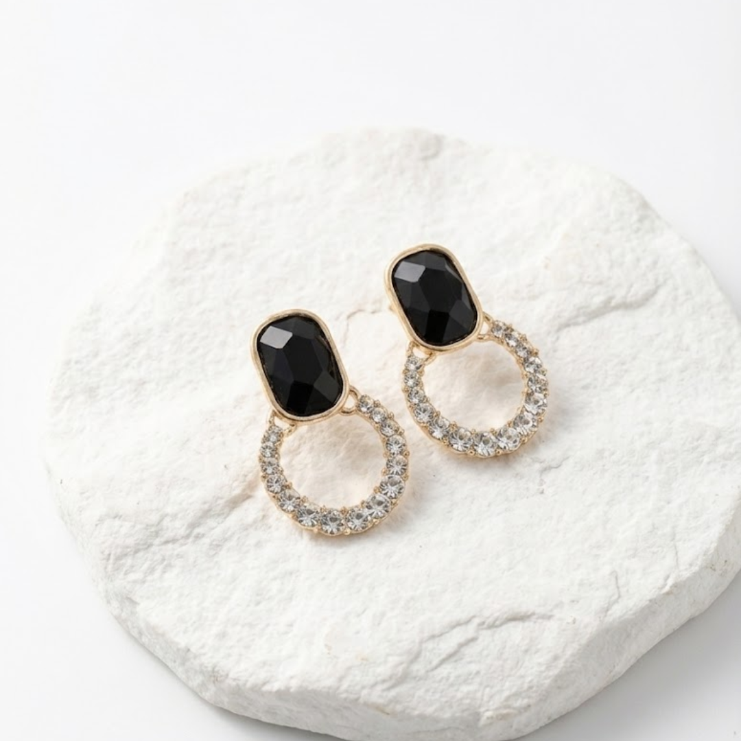 Command the room with the Black Diamond Dazzlers, the ultimate accessory for evening glamour. These luxurious earrings feature a bold, faceted black stone in a sleek rectangular cut that sits elegantly on the ear. Hanging from this dramatic dark base is a brilliant circular hoop, fully encrusted with sparkling clear crystals that catch the light from every angle. The rich gold-tone setting ties the look together, creating a stunning contrast between the deep noir top and the radiant diamond-like bottom.